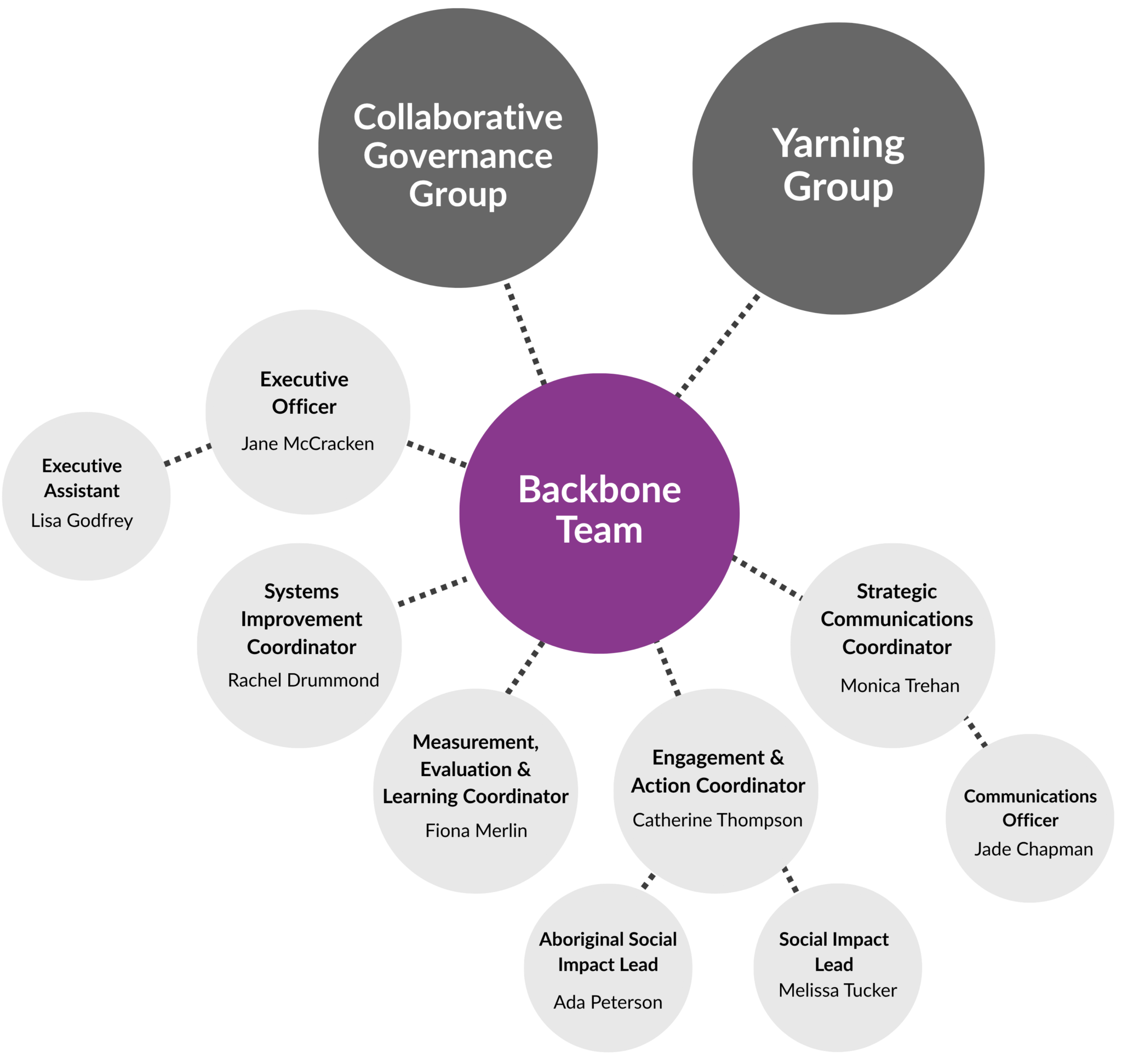 Our unique structure is made up of the Collaborative Governance Group, Yarning Group and Backbone Team. Purpose-built and co-designed with community, our shared governance model brings together people with lived experience, cultural knowledge, service expertise and strategic influence. This collective approach helps us stay grounded, inclusive and accountable as we work towards long-term social change.
