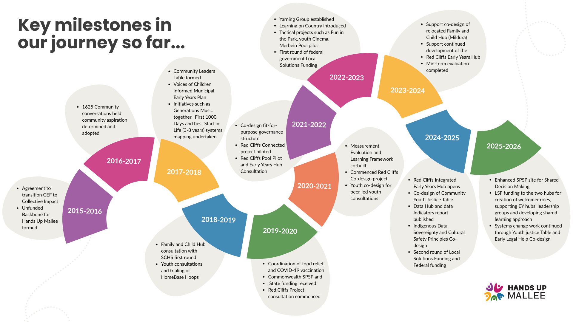 Together, these efforts reflect a maturing phase of Hands Up Mallee’s work, one that continues to centre community voice but is increasingly focused on embedding that voice in the structures, partnerships, and decisions that shape the outcomes for the community.